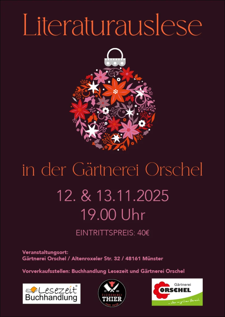 Karten zum Preis von 40 € pro Person bekommen Sie exklusiv in der Gärtnerei Orschel oder in der Buchhandlung Lesezeit.