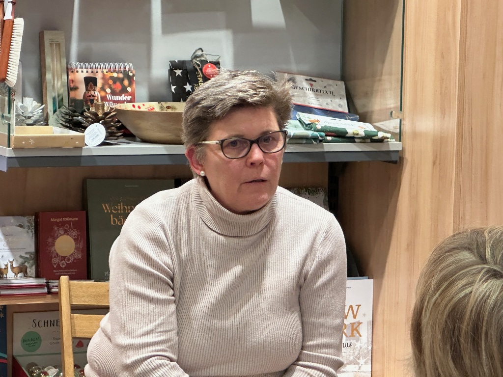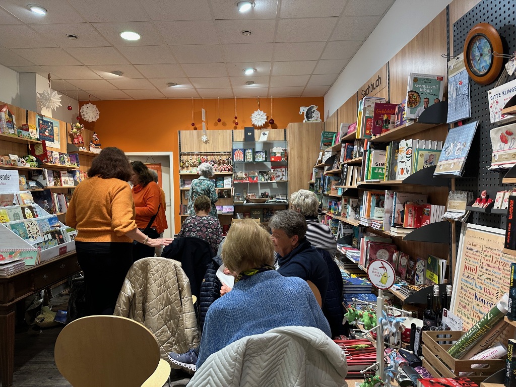 Hildegard Vogel (Buchhandlung Lesezeit) und Beate Frankrone (Bücherei St. Anna) stellten neue Literatur in der Buchhandlung Lesezeit vor. Den Anfang machte Beate Frankkrone mit einem Gedicht von Agnes Miegel: